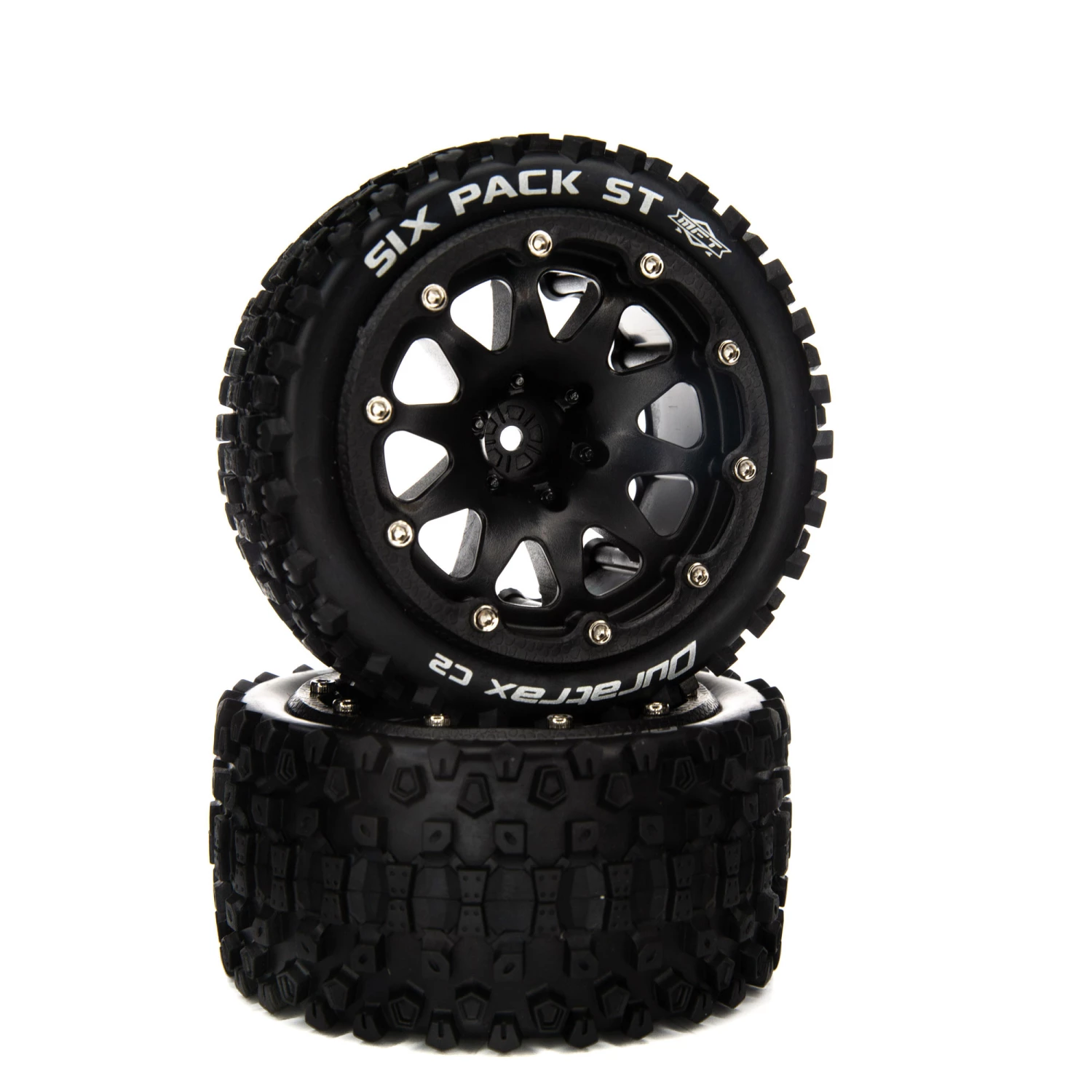 Factory-mounted, these Duratrax® SIX PACKâ„¢ ST front/rear tires for the 1/10 scale ARRMA® GRANITEâ„¢ 4X4 BLX Monster Truck feature a tread pattern that’s perfect for running on a wide range of surfaces — including asphalt, grass, and loose or hard-packed soil — and in wet or dry conditions. Molded from a durable black composite plastic, the 14mm hex wheels measure 2.8 inches (56.3mm) wide and 4.8 inches (122.1mm) in diameter. The belted tires include one-piece foam inserts and white sidewall markings, and are made from high-traction C2 soft compound. Sold in pairs.